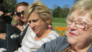Then came the actual hayride, and poor Dee Dee! Not that any of the women over the age of 40 enjoyed the hayride all that much, but man-oh-man, Dee Dee!!!! For starters, the hayride was extraordinarily bumpy. Secondly, the course had about 24-hours worth of rain soaked into the track, turning the hayride into more of a mud-ride. By the end of the hayride, Aunt Shannon's great idea had almost turned Dee Dee catatonic! This is her about midway through: